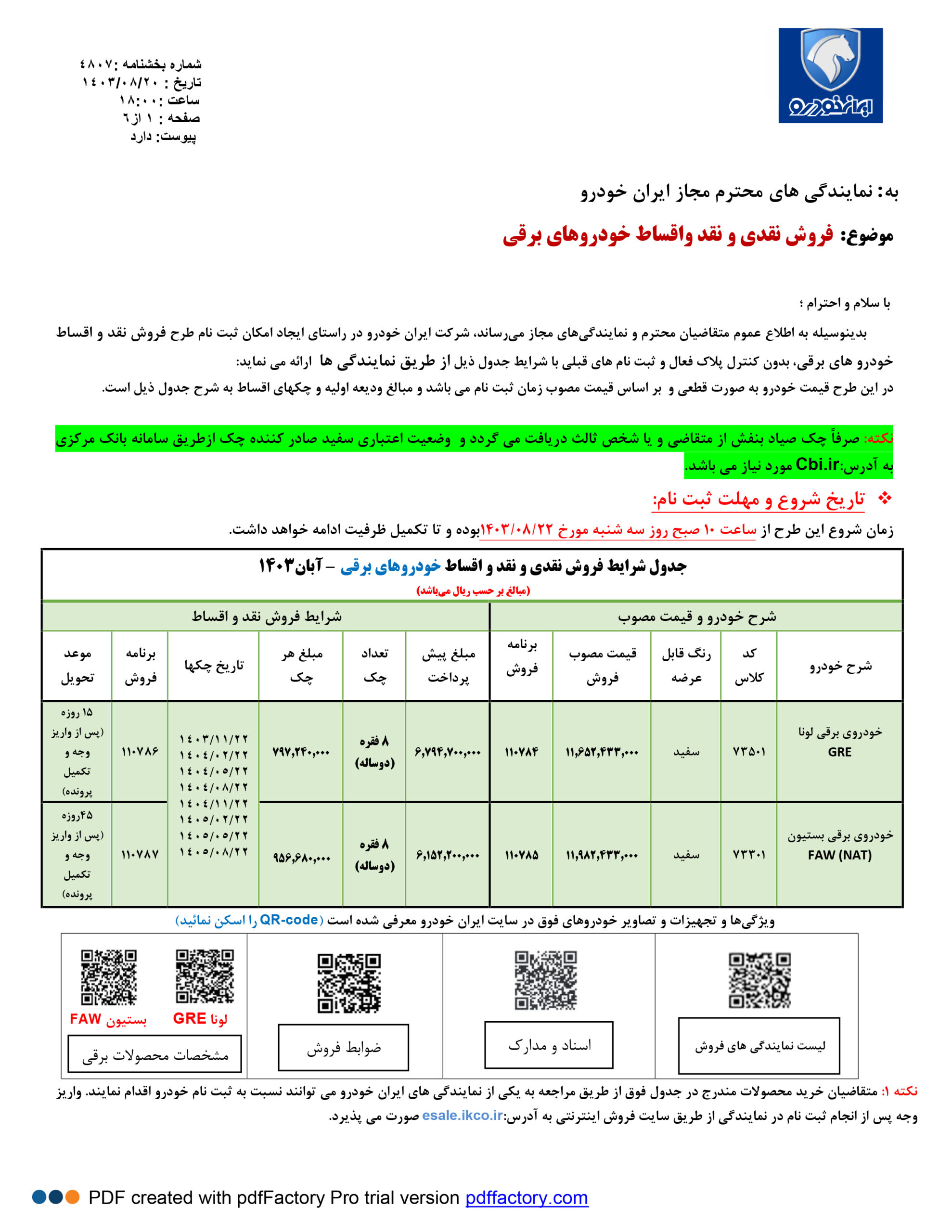 بدينوسيله به اطلاع عموم متقاضيان محترم و نمايندگيهاي مجاز ميرساند، شركت ايران خودرو در راستاي عرضه مستقيم محصولات خود، امكان ثبت نام طرح فروش نقدي و نقد و اقساط خودروهاي برقي، بدون كنترل پلاك فعال و ثبت نام هاي قبلي با شرايط جدول ذيل ارائه مي نمايد: