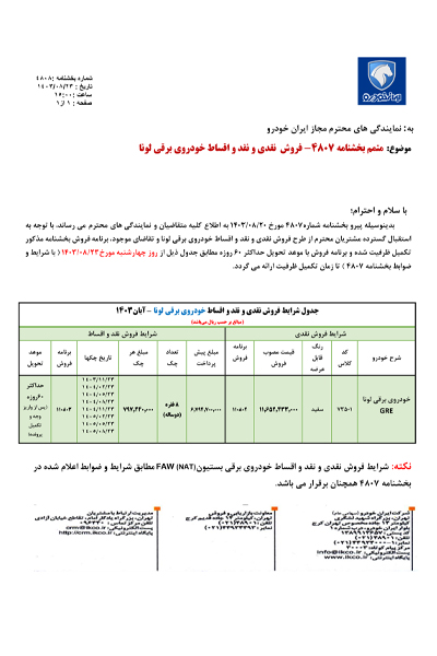 بدينوسیله پیرو بخشنامه شماره 4807 مورخ 20 / 08 / 1403 به اطلاع کلیه متقاضیان و نمايندگي هاي محترم مي رساند، با توجه به استقبال گسترده مشتريان محترم از طرح فروش نقدي و نقد و اقساط خودروي برقي لونا و تقاضاي موجود، برنامه فروش...