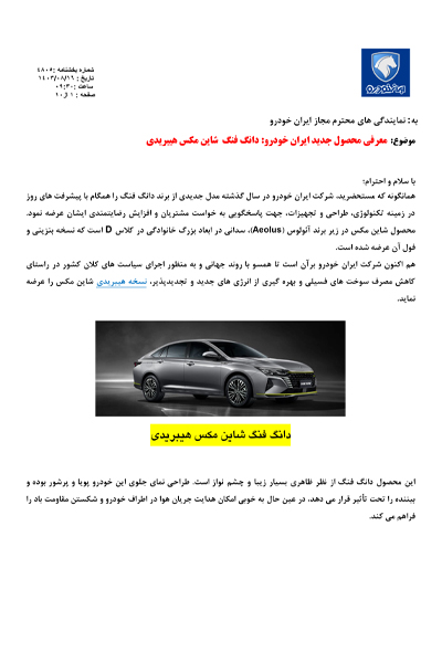 اطلاعیه شماره 4805 معرفي محصول جديد ايران خودرو: دانگ فنگ شاين مکس هيبريدی