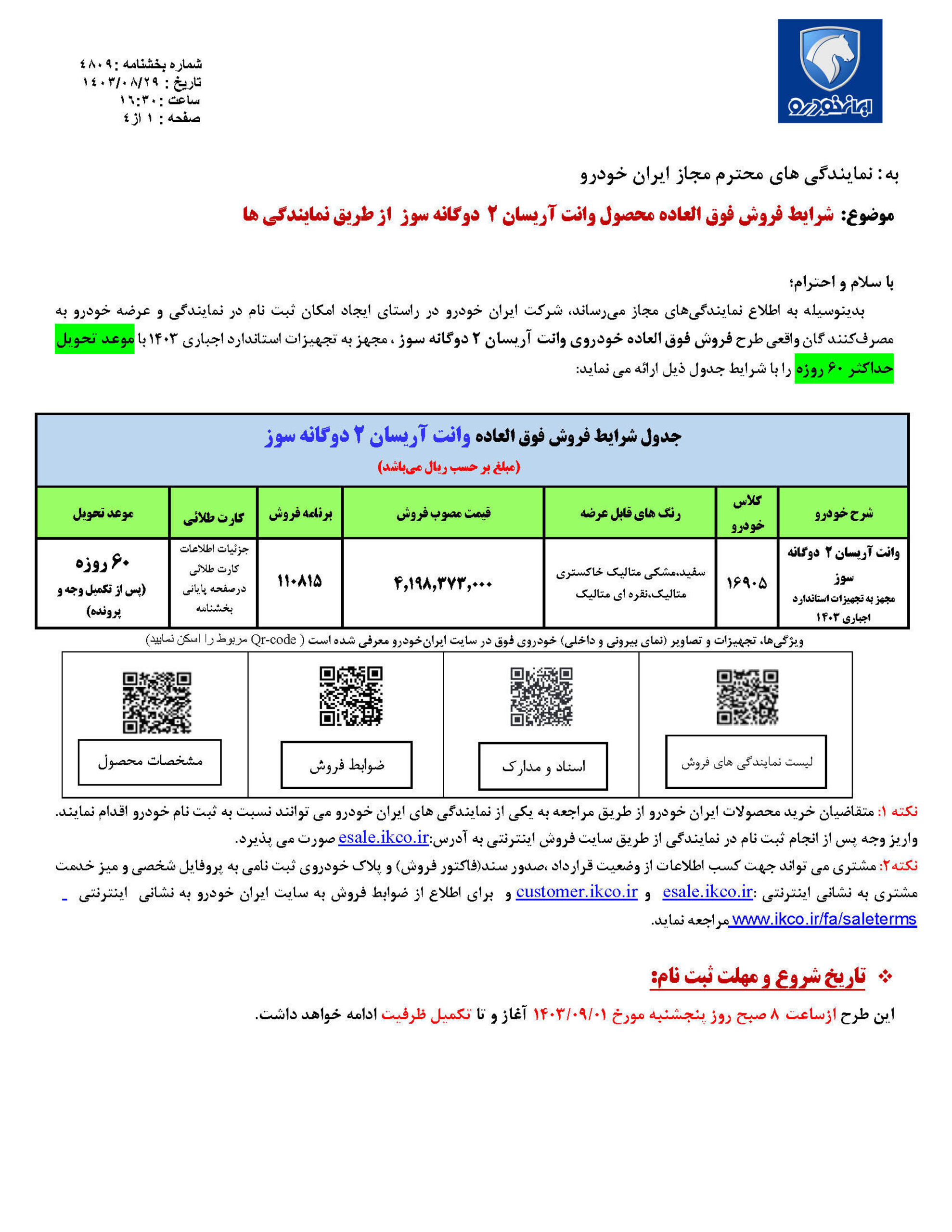 بدينوسيله به اطلاع عموم متقاضيان محترم و نمايندگيهاي مجاز ميرساند، شركت ايران خودرو در راستاي عرضه مستقيم محصولات توليدي امكان ثبت نام طرح فروش فوري خودروي وانت آريسان 2 دوگانه سو ز، بدون كنترل پلاك فعال و ثبت نام هاي قبلي با شرايط جدول ذيل ارائه مي نمايد: