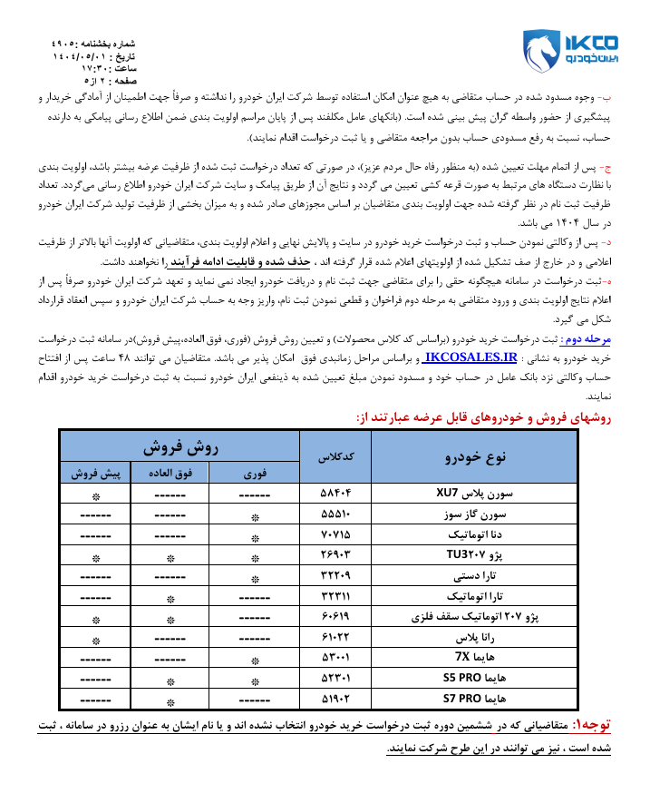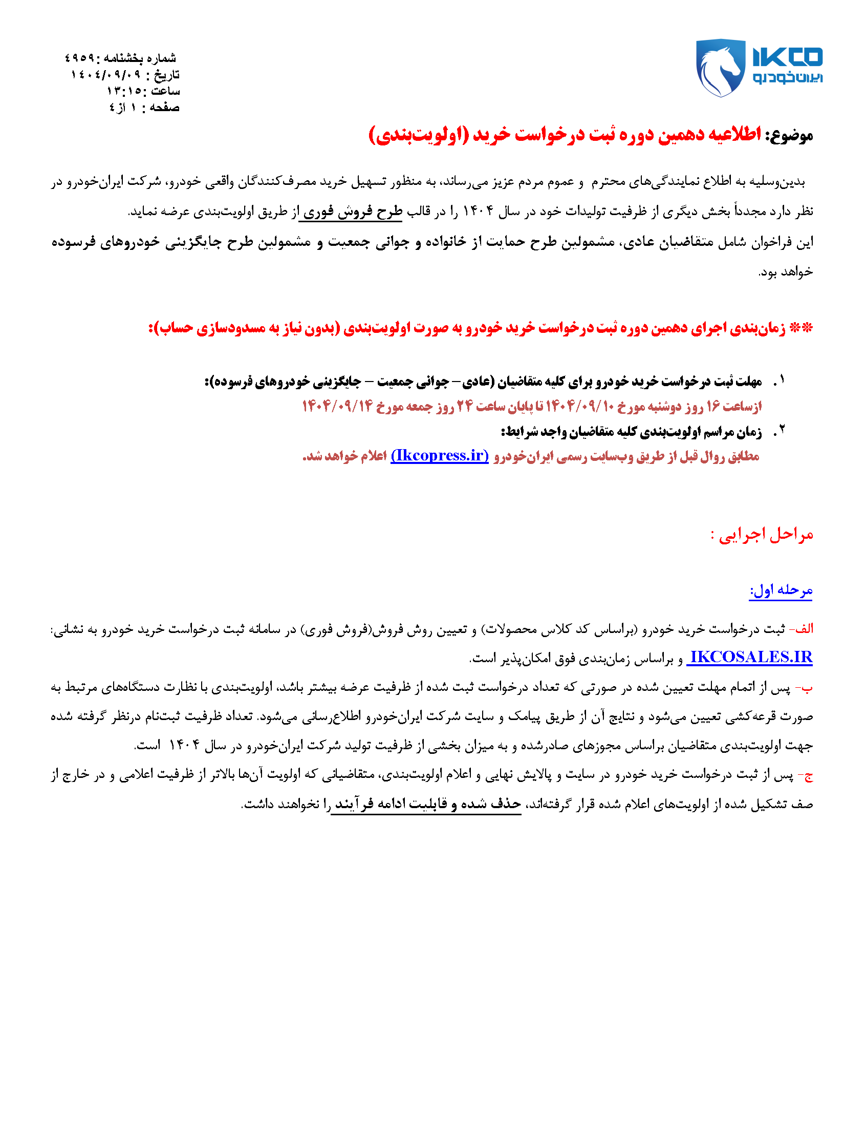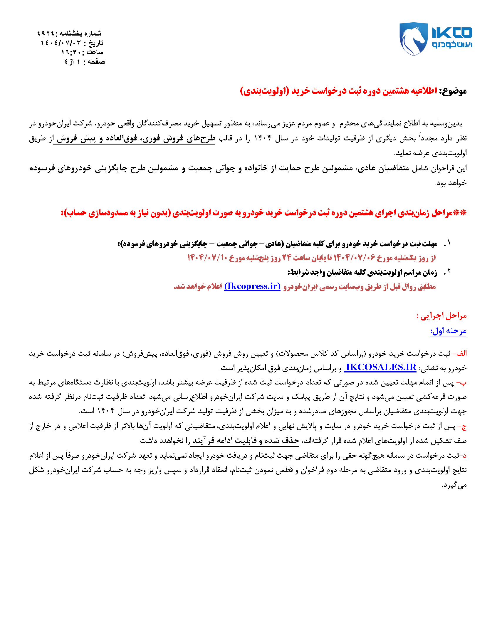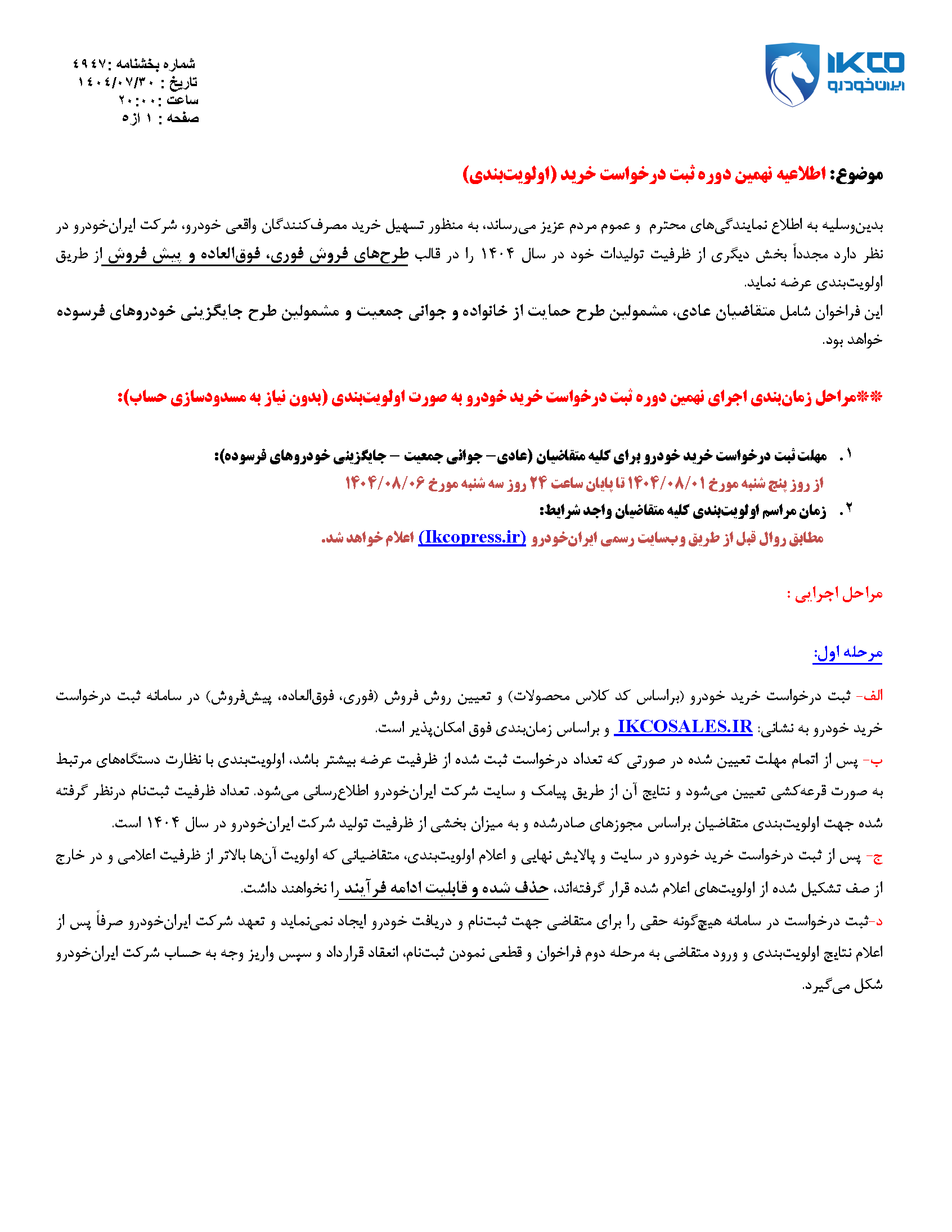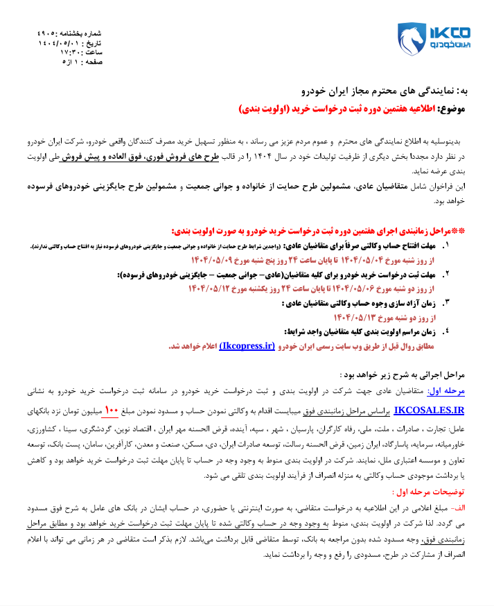 بدينوسليه به اطلاع نمايندگي هاي محترم و عموم مردم عزيز مي رساند ، به منظور تسهيل خريد مصرف كنندگان واقعي خودرو، شركت ايران خودرو در نظر دارد مجددا بخش ديگري از ظرفيت توليدات خود در سال 1404 را در قالب طرح هاي فروش فوري، فوق العاده و پيش فروش طي اولويت بندي عرضه نمايد.