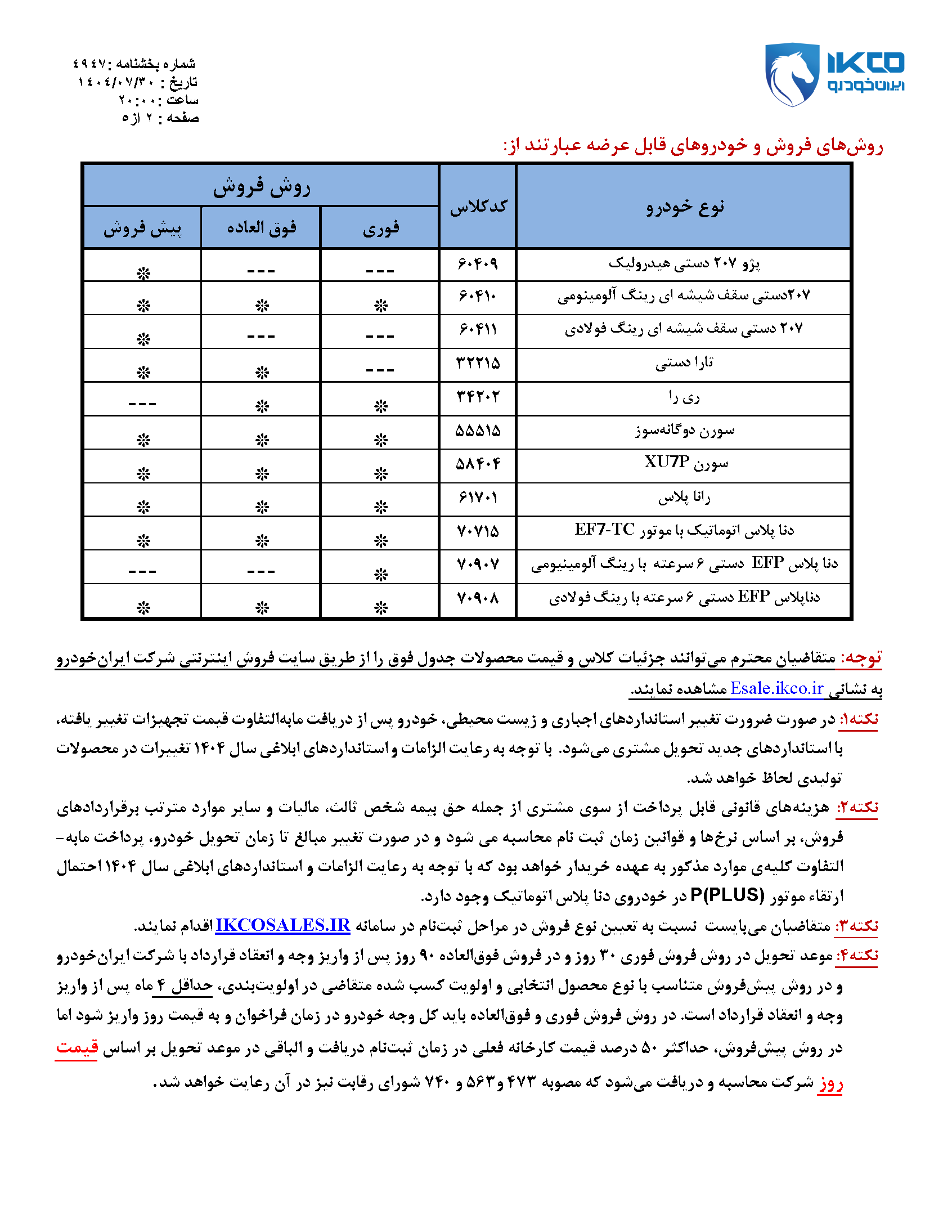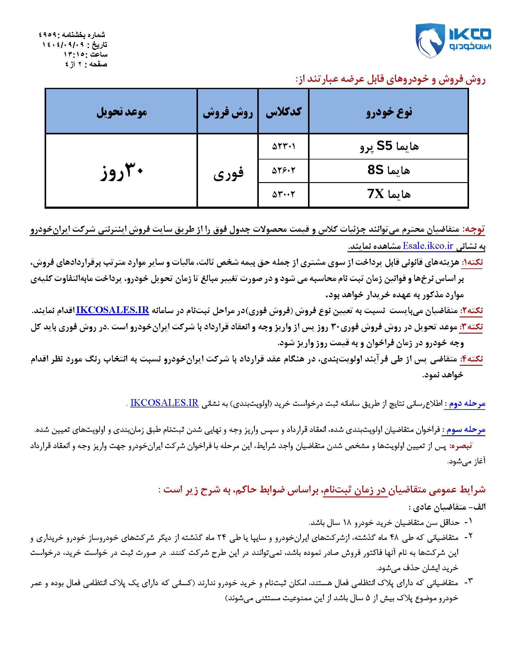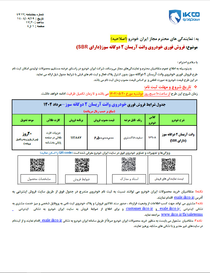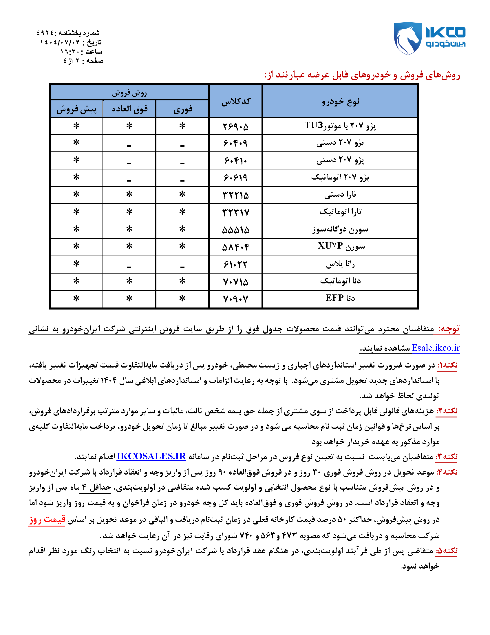 بدينوسليه به اطلاع نمايندگي هاي محترم و عموم مردم عزيز مي رساند ، به منظور تسهيل خريد مصرف كنندگان واقعي خودرو، شركت ايران خودرو در نظر دارد مجددا بخش ديگري از ظرفيت توليدات خود در سال 1404 را در قالب طرح هاي فروش فوري، فوق العاده و پيش فروش طي اولويت بندي عرضه نمايد.