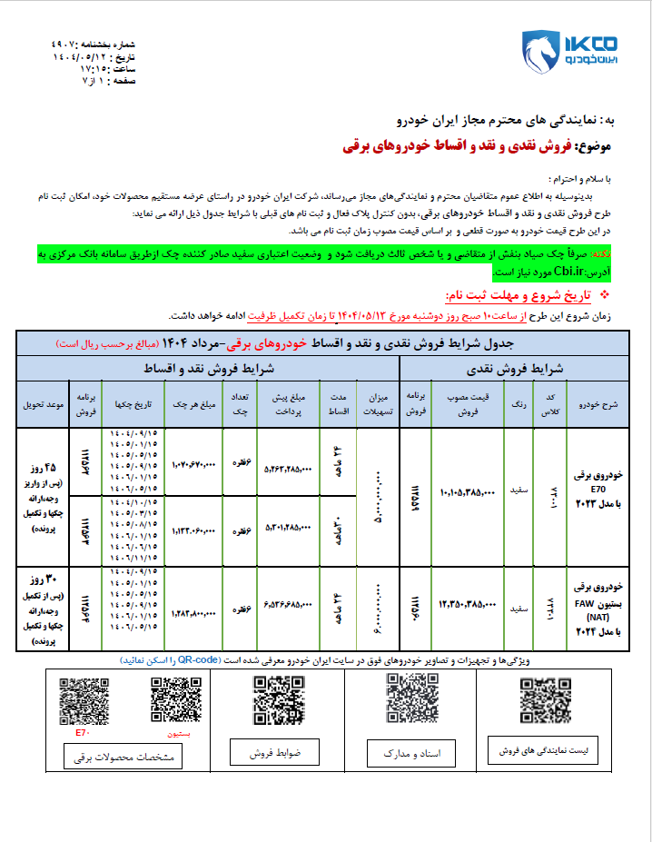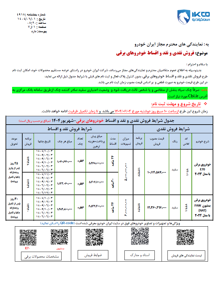 بدينوسيله به اطلاع عموم متقاضيان محترم و نمايندگي هاي مجاز مي رساند، شركت ايران خودرو در راستاي عرضه مستقيم محصولات خود، امكان ثبت نام طرح فروش نقدي و نقد و اقساط خودرو برقي E70، بدون كنترل پلاك فعال و ثبت نام هاي قبلي با شرايط جدول ذيل ارائه مي نمايد:
