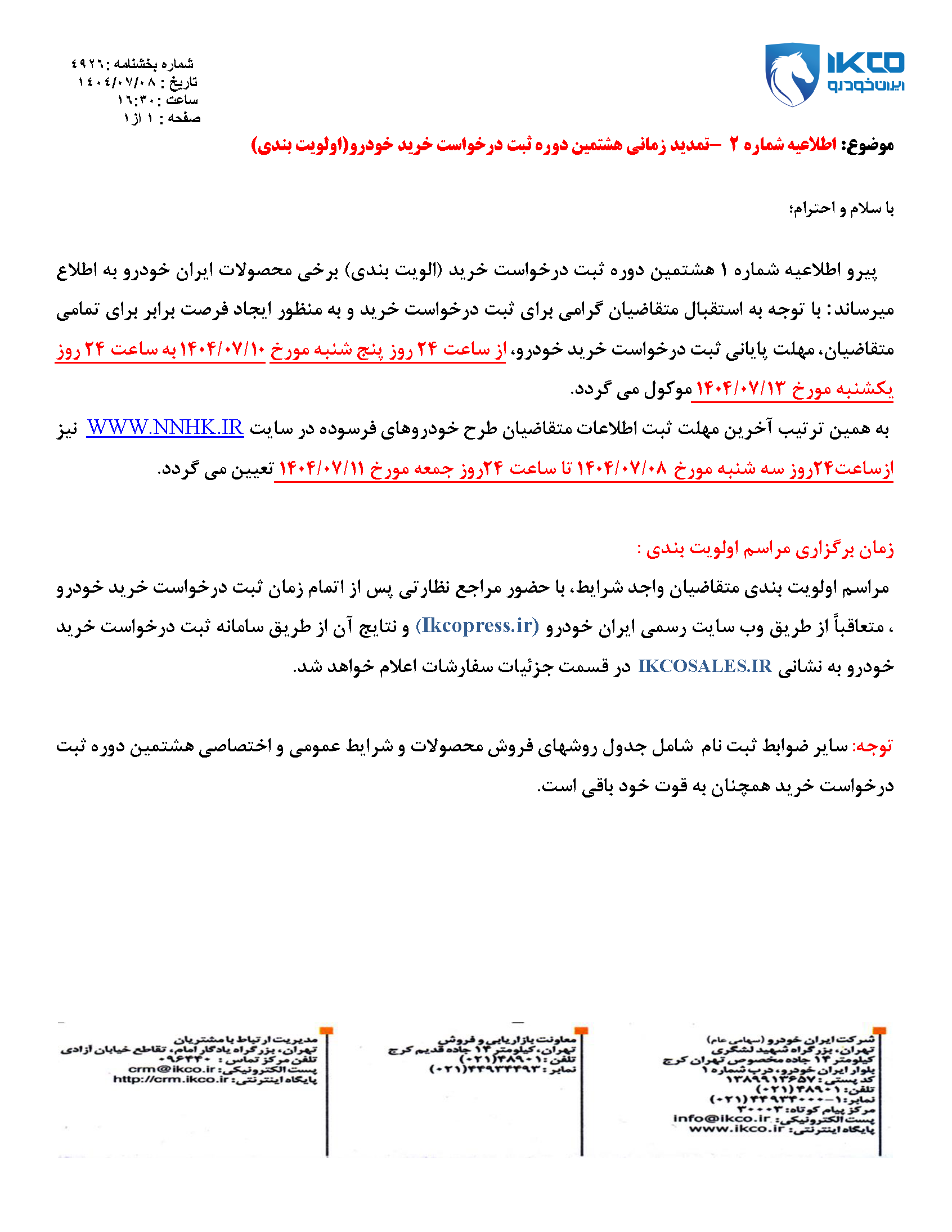 پيرو اطلاعيه شماره 1 هشتمين دوره ثبت درخواست خريد )الويت بندي( برخي محصولات ايران خودرو به اطلاع ميرساند : با توجه به استقبال متقاضيان گرامي براي ثبت درخواست خريد و به منظور ايجاد فرصت برابر براي تمامي متقاضيان، مهلت پاياني ثبت درخواست خريد خودرو، از ساعت 24 روز پنج شنبه مورخ 10 / 07 / 1404 به ساعت 24 روز يكشنبه مورخ 13 / 07 / 1404 موكول مي گردد.