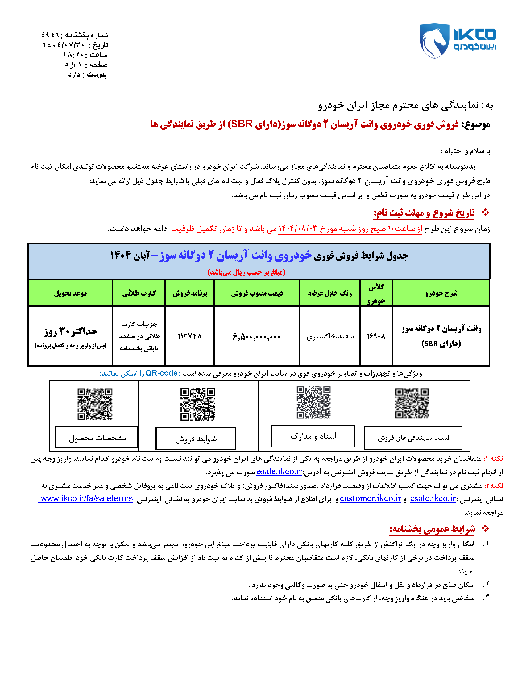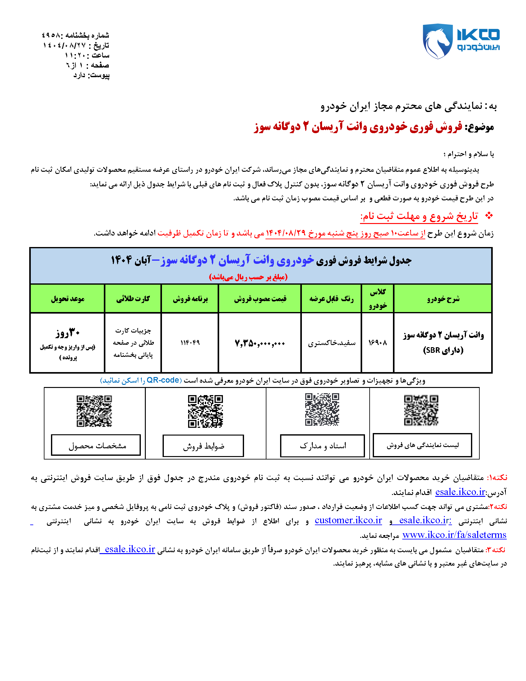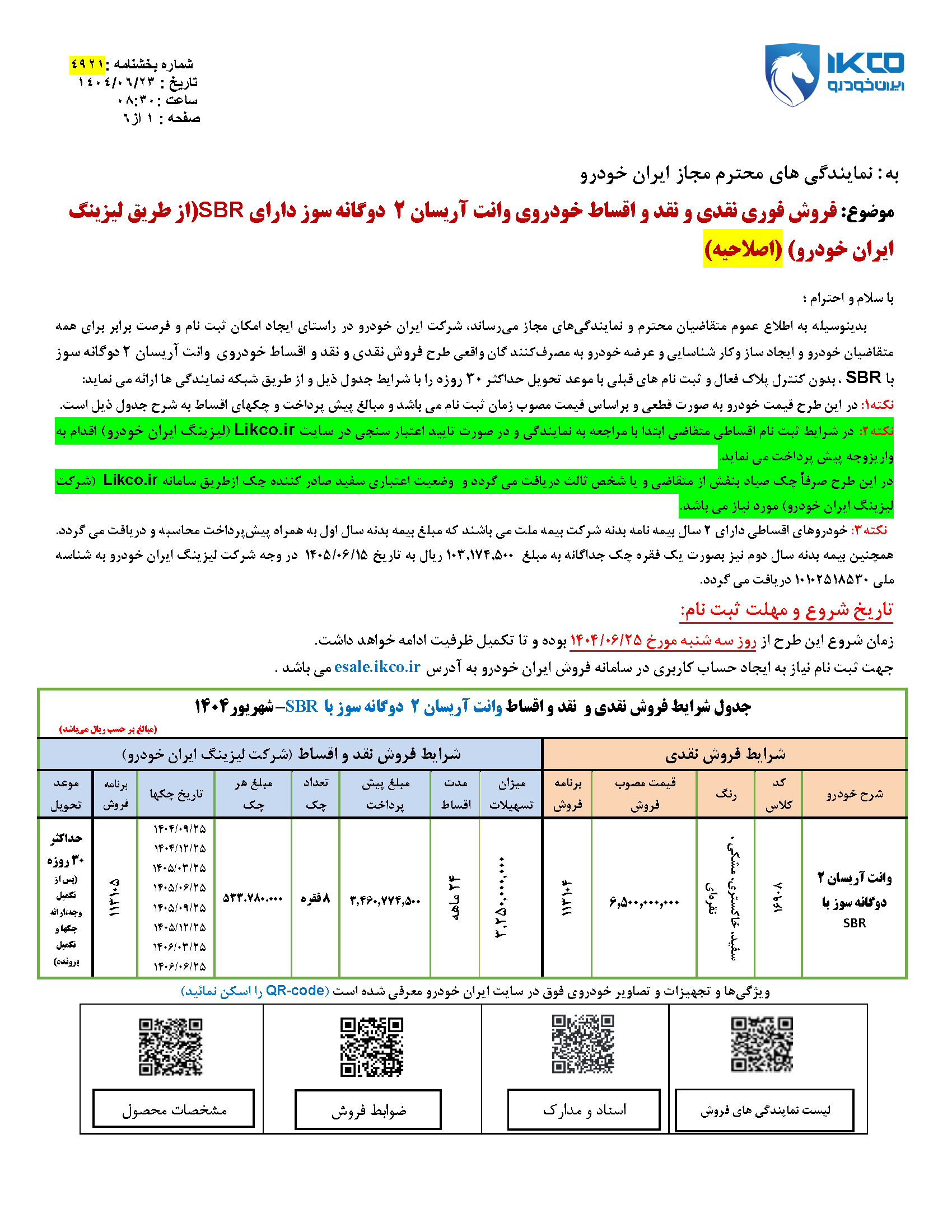 بدينوسيله به اطلاع عموم متقاضيان محترم و نمايندگيهاي مجاز مي رساند، شركت ايران خودرو در راستاي ايجاد امكان ثبت نام و فرصت برابر براي همه متقاضيان خودرو و ايجاد ساز وكار شناسايي و عرضه خودرو به مصرفكنند گان واقعي طرح فروش نقدي و نقد و اقساط خودروي وانت آريسان 2 دوگانه سوز با SBR، بدون كنترل پلاك فعال و ثبت نام هاي قبلي با موعد تحويل حداكثر 30 روزه را با شرايط جدول ذيل و از طريق شبكه نمايندگي ها ارائه مي نمايد: